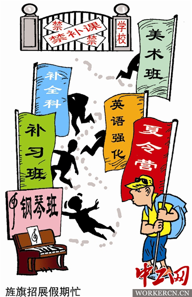 记者在安徽、江西调查发现,“学生一周补课6天”“在职老师变身补习班老师”等现象依然不同程度存在,漫漫暑期成了学生和老师忙碌的“补课时光”。(《北京晨报》7月20日)