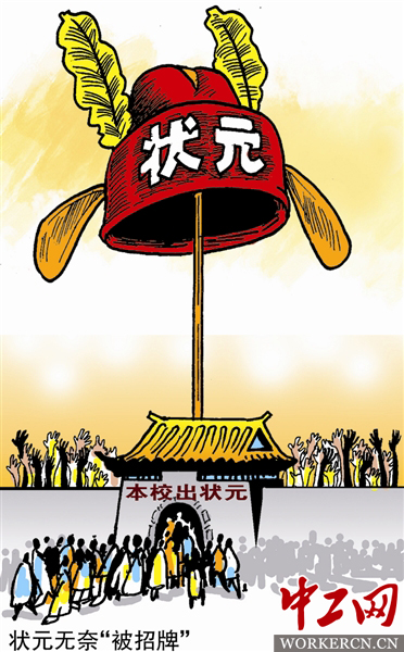 在状元崇拜风气之下,每年都会发生激烈的“状元争夺战”,各学校都争着说状元是自己培养的,在媒体上高调亮相、极力推介,因为有的是“裸分状元”,有的是“加分后的状元”。浮躁、市侩的商业化办学思路,对社会和家长产生了严重误导——培养高分考生的学校才是好学校,却不知此举违背了教育规律,扔掉了最起码的教育责任。