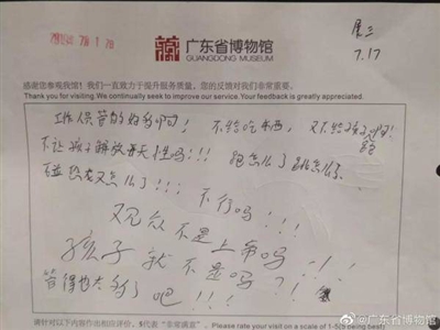 近日,一张广东省博物馆的观众留言本照片在网上引起热议,有人在留言本上,发出了灵魂质疑:博物馆工作人员“管得好多啊”“不让孩子解放天性吗?”。“跑怎么了跳怎么了?碰恐龙又怎么了……”(8月5日《南国早报》)