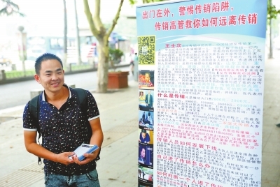 6月13日上午,洛阳周王城广场,一名男子边唱反传销歌曲,边向路人散发宣传单。他叫王士次,今年28岁,20岁时曾被朋友骗进传销组织,做到高管才发现一切都是骗人的。看着有人卖车卖房筹钱加入传销组织,甚至妻离子散家破人亡,他毅然决然离开传销组织,并走上了公开反传销的道路。(6月17日《大河报》)