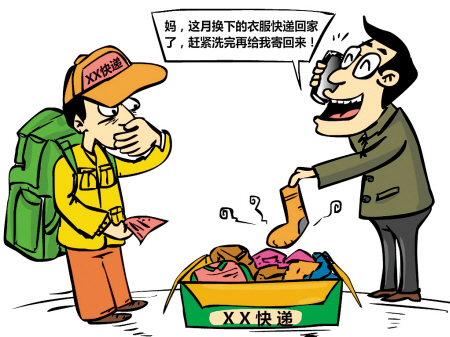 在3月9日晚全国“两会”新闻中心举行的网络访谈中,国家邮政局市场监管司副司长刘良一爆料:由于快递业务的便捷,眼下,高校学生把积攒的脏衣服寄洗,再通过快递寄回来,成了邮政的一种新业务。(3月11日《长沙晚报》)