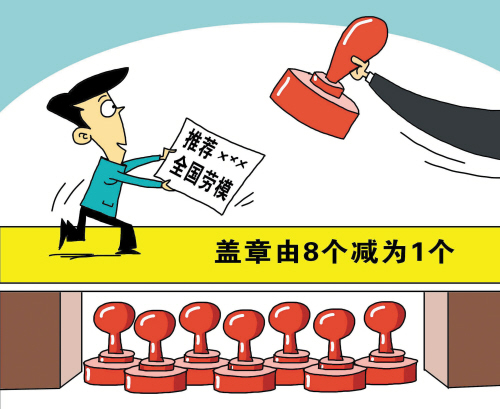 针对近日有媒体反映劳模评选盖章多问题,人力资源和社会保障部昨天表示,我国劳模评选将简化程序强化监督,今后推荐企业负责人为全国劳模将简化程序,取消不必要的部门盖章,将8个章减少为1个章。(7月16日《长沙晚报》)