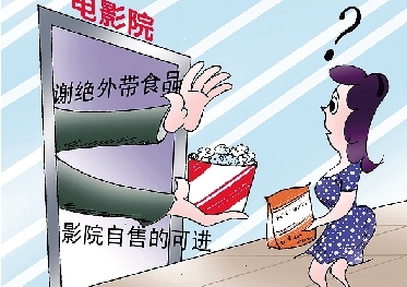日前,有媒体记者探访南京多家电影院,发现大部分电影院都是拒绝外带食品进入的,其中5家影院还在检票口摆上了“谢绝外带食品”告示牌。对此,消协相关人士表示,影院的做法属“霸王条款”,如果市民发现这类情况,可以拨打“12315”投诉。(7月20日《现代快报》)