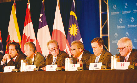 10月5日,在美国亚特兰大,美国贸易代表迈克尔·弗罗曼(左三)和参加TPP谈判的各国贸易部长出席记者会。新华社记者高攀摄