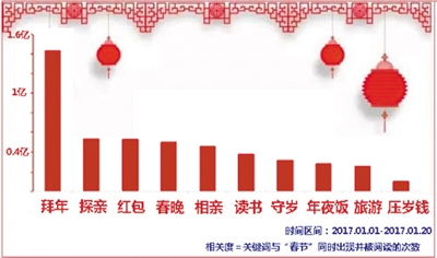 在微博空间,有关春节的何种话题互动热度较高?打开客户端,用户倾向于浏览哪些题材的春节新闻?逛淘宝店铺,哪些是成交量排名靠前的“年货爆款”?“年年岁岁花相似,岁岁年年人不同”。鸡年新春来临之际,无论处身繁华的都市还是广袤的乡村,年的味道日渐浓厚。而来自网络平台的数据,刻录下人们注意力分配的状况,让人感受到中国人“变”与“不变”的春节温情。