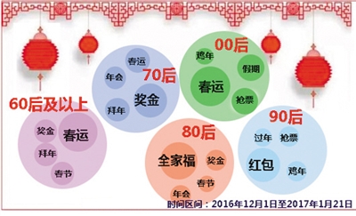不同群体,对于“中国年”有着不同期盼。人民网舆情监测室的数据统计显示,00后、60后最关注春运如何回家,90后最多的注意力在抢红包,晋升为家庭主要支柱的80后们则更愿意携带一家老小通过全家福记录下温馨的春节时光,70后更关注一年辛苦得来的奖金……这一组涵盖各个年龄段人群的数据,无疑是当今中国的一个缩影,可以从中体会人群的流动、代际的更替,更可以从中勾画出千家万户阖家团聚、其乐融融的年景。