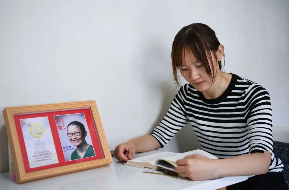陈志昊在家中翻看硕士论文参考资料,旁边放着她在武汉战疫一线的留影(5月10日摄)。新华社记者 邓华 摄