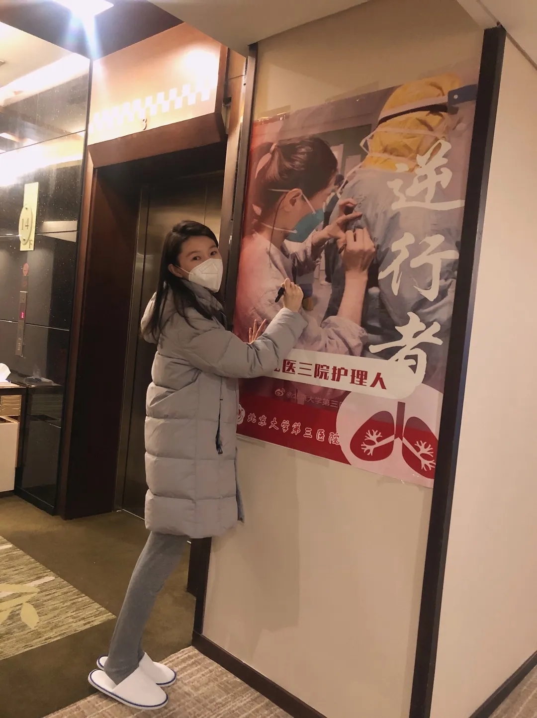 北京大学第三医院危重医学科护士张佳男在武汉驻地与张贴的海报合影(2月16日摄)。海报照片拍摄于1月29日凌晨三点,张佳男和队员们进入华中科技大学同济医院中法新城院区隔离病房第一晚,当时张佳男正在给队友的防护服上写字。新华社发