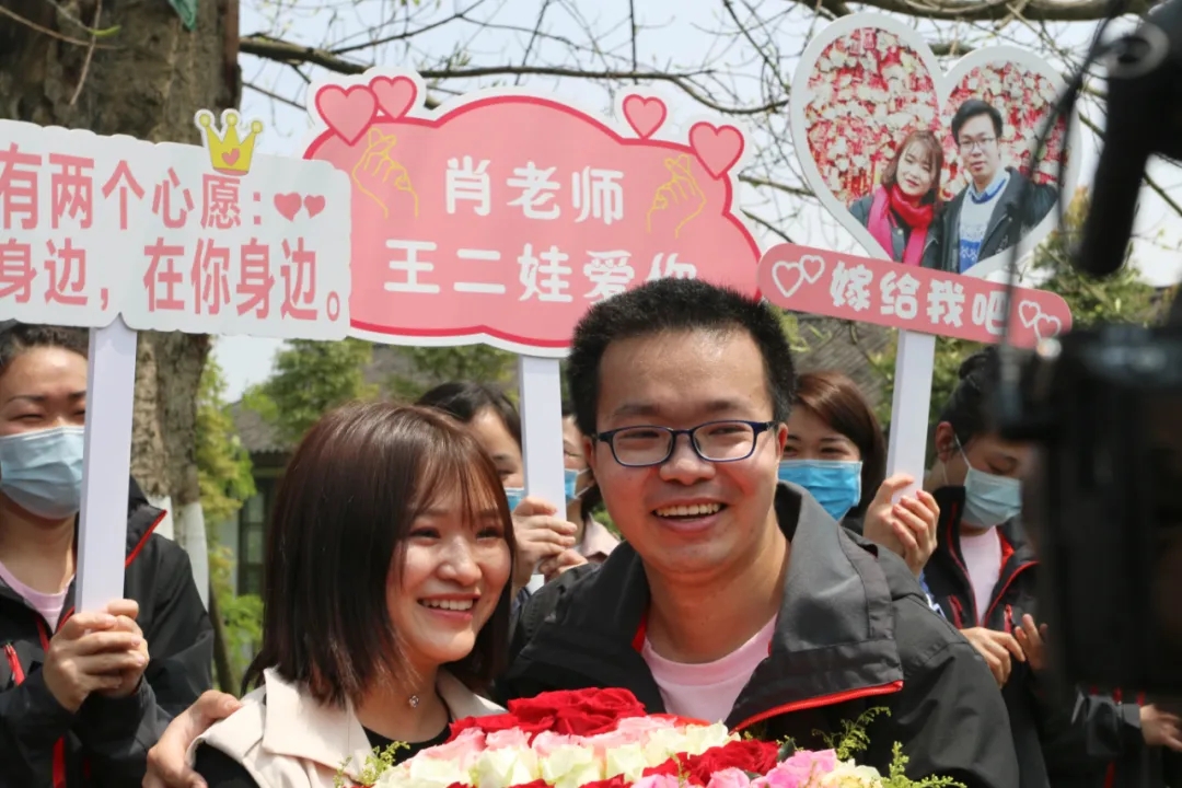 成都医学院第一附属医院重症医学科男护士、四川省第三批援湖北医疗队队员王旭涛(左)返回四川隔离期满后第一时间向护士女友肖雪梅求婚(4月14日摄)。新华社发
