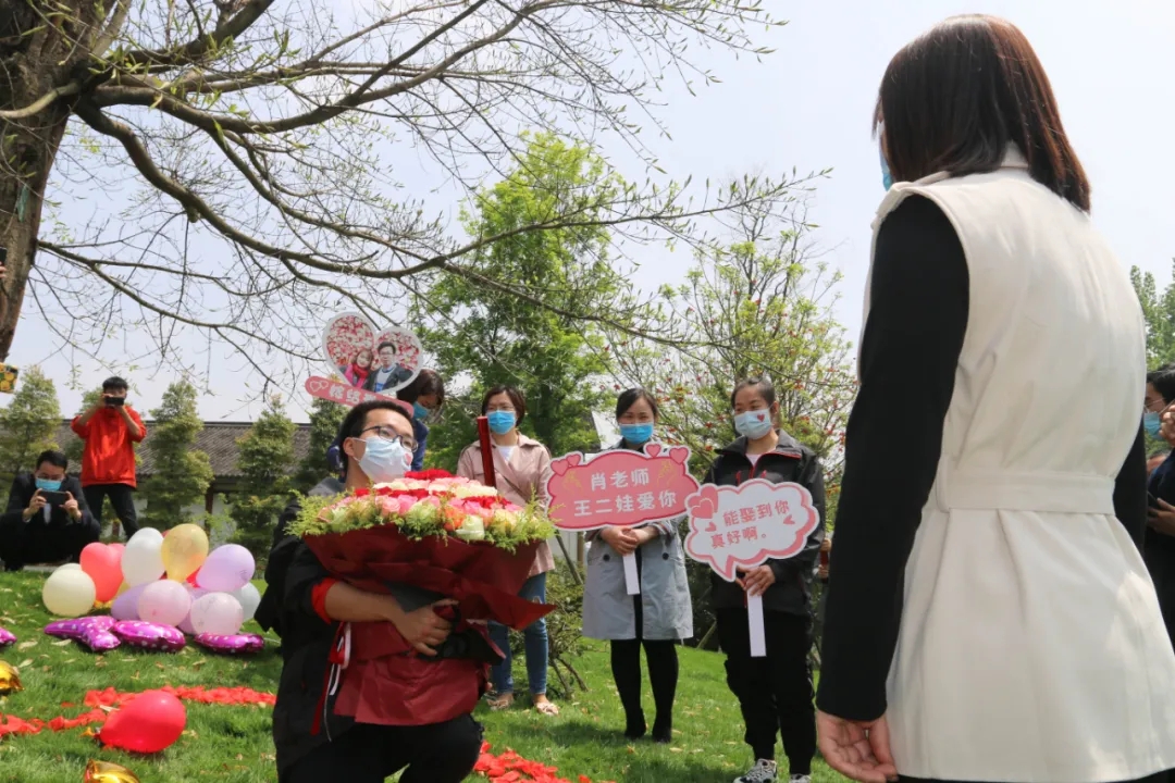 成都医学院第一附属医院重症医学科男护士、四川省第三批援湖北医疗队队员王旭涛返回四川隔离期满后第一时间向护士女友肖雪梅求婚(4月14日摄)。新华社发
