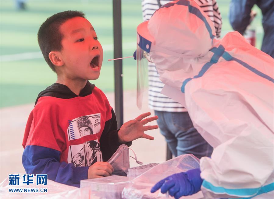 在武汉东西湖区吴家山第一小学操场检测点,工作人员对市民进行核酸检测。新华社 肖艺九 摄