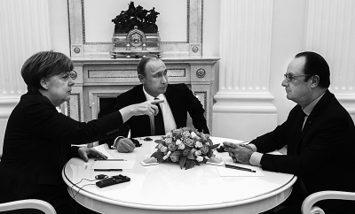6日晚6时许,德法首脑先后飞抵莫斯科,并立即开始在克里姆林宫与俄总统普京举行会谈。三国首脑围坐在一个直径不超过一米的圆桌旁,在没有任何陪同人员的情况下,进行了长达5小时的“面对面”交谈。从电视画面上看,普京从容镇定,默克尔略显不安,奥朗德神态自若。5小时会晤后,德法首脑立即赶赴机场。如此“下机即谈,谈完即走”的节奏再次凸显出此次三方会谈的价值和影响力,同时也给媒体和分析人士留下了丰厚的想象空间。