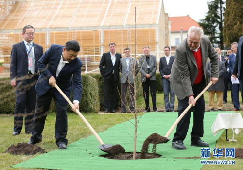 3月28日,国家主席习近平在与捷克总统泽曼举行会晤之前,两国元首在布拉格拉尼庄园一起种下一株来自中国的银杏树苗,共同为树苗培土、浇水。