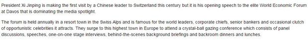 中国国家领导人习近平主席正在进行新世纪对瑞士的首次访问,同时习主席还将出席达沃斯世界经济论坛年会,这是中国国家主席首次出席这一盛会,必将成为全球媒体的焦点。