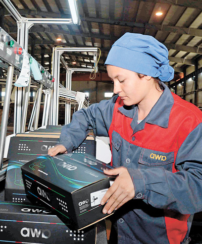 乌兹别克斯坦鹏盛工业园区,工人在水龙头生产车间工作。