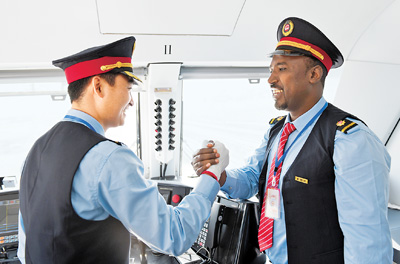埃塞俄比亚拉布车站,中埃双方司机在握手预祝通车成功。