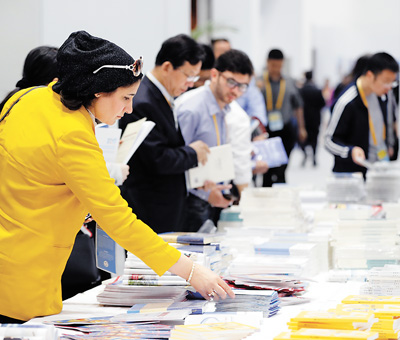 媒体记者在新闻中心取阅资料。