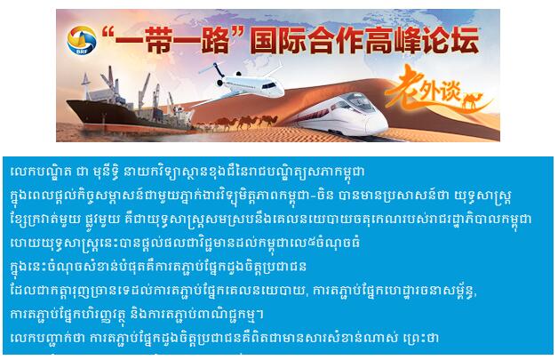 柬埔寨洪森首相也参加了这次高峰论坛,我认为首相对中国的访问会让更多中国投资者和游客来到柬埔寨,这会对我们维持经济稳定和贸易平衡有好处,也会是一个共同回顾已有成绩、寻找新的更多的发展的极好机会。