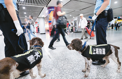 6月15日,民警携捜爆犬在上海地铁徐家汇站值勤。 新华社记者 凡 军摄 |