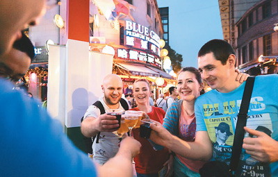 6月8日,来自乌克兰的游客在浙江宁波老外滩品尝美酒。 新华社记者 翁忻旸摄 |