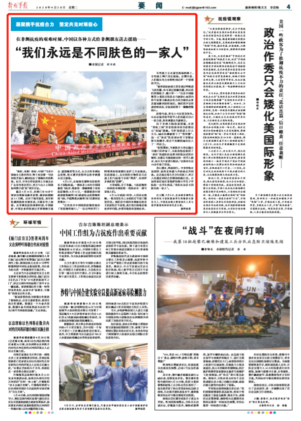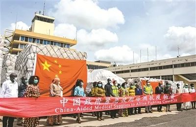 4月6日,在加纳首都阿克拉的科托卡国际机场,一架机身上印有中国国旗的飞机旁,堆放着一排刚卸载下来的抗疫物资;4月15日,一架满载着中国政府援助刚果(布)政府抗击疫情物资的飞机,平稳降落在刚果(布)首都布拉柴维尔……