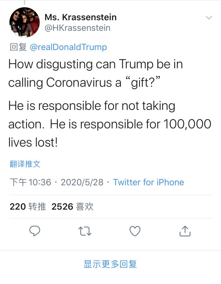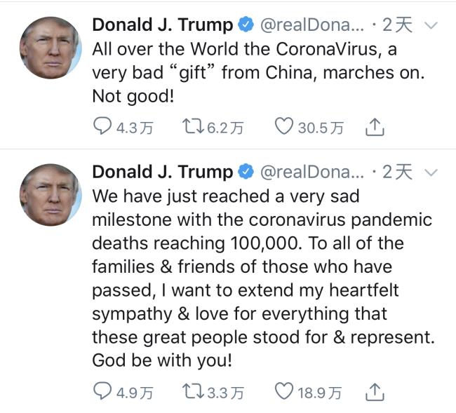 5月28日,美国新冠肺炎患者死亡人数超过10万,特朗普为此专门发推,推文这样写到,“我们(美国)刚刚到达了一个非常可悲的里程碑,新冠肺炎病毒感染患者死亡人数达到10万,对所有逝者的家人和朋友,我要对这些伟大的人所拥护和代表的一切表达由衷的同情和爱。愿上帝与你们同在!”随即,他又发了另一条推文,“肆虐全球的新冠病毒是来自中国的一个非常糟糕的‘礼物’。”