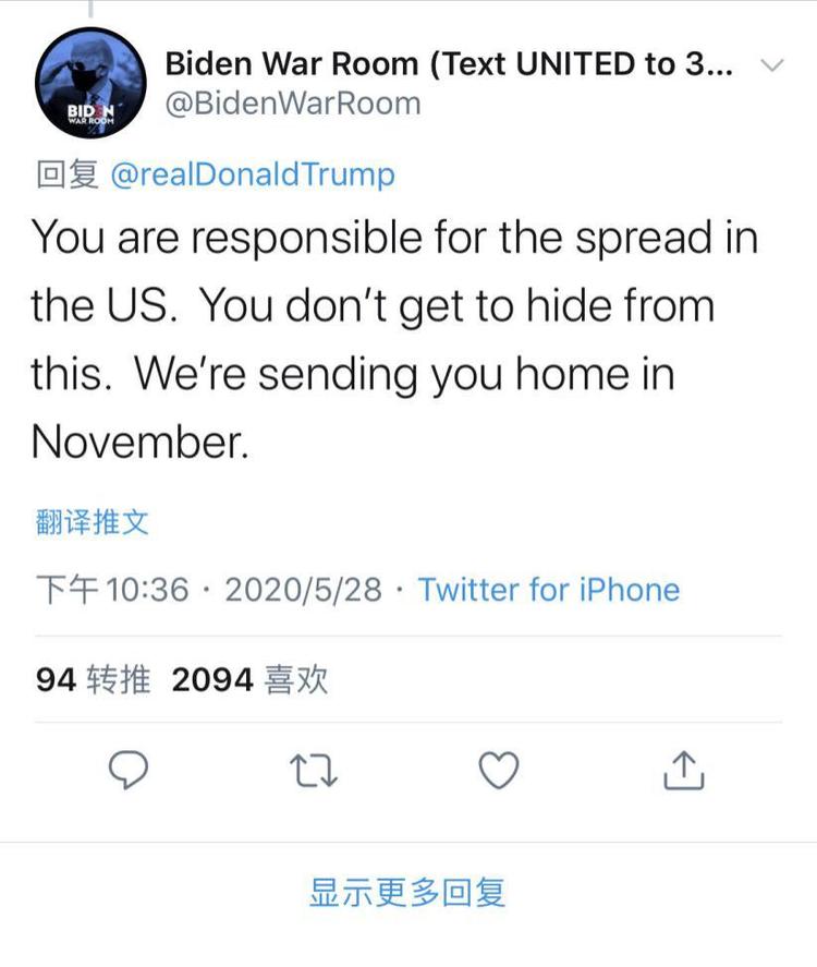 特朗普言下之意很明显,就是继续玩弄甩锅推责的把戏。他想告诉美国人民——美国新冠肺炎患者死亡超过10万了,但这一切都是中国的错。但是特朗普这种推责的把戏显然没有愚弄所有美国民众,不少美国网友在这条推文下跟帖留言,表示特朗普应为美国的疫情扩散负责,并称将在11月把他“送回老家”。