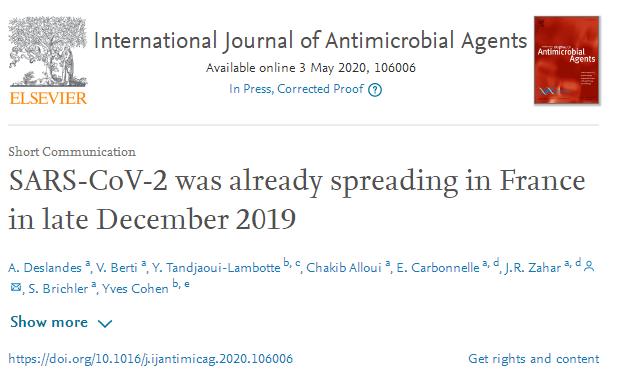 5月3日,医学期刊《国际抗菌剂杂志》发表了一篇题为《新冠病毒2019年12月底已在法国传播》的短篇通讯论文。该论文指出,去年12月27日一名法国男性即因新冠肺炎住院。由于该病例与中国缺乏关联,病毒可能去年底已在法国传播。5月7日,法国科尔马市阿尔贝·施韦泽医院发布公告称发现去年11月至12月间共有15例新冠肺炎疑似病例,最早可追溯到去年11月16日,并初步确认12月2日收治的一名男性患者为感染者。