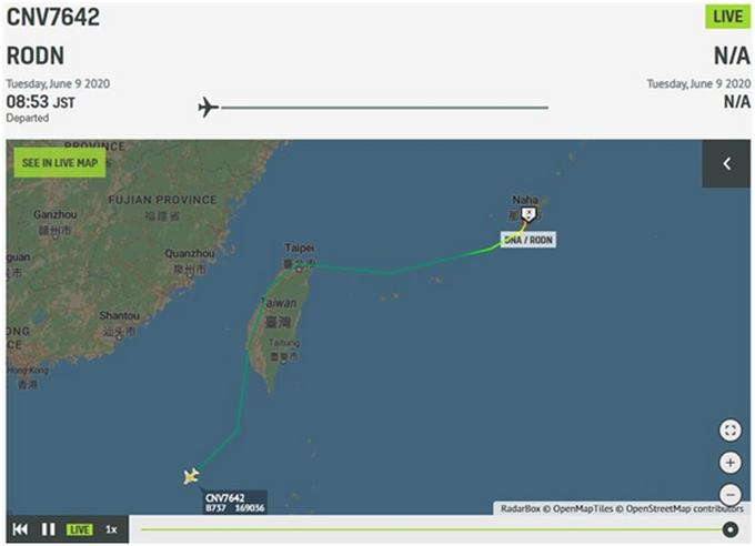 6月9日,美军1架C-40运输机飞越台湾岛西海岸空域,严重违反国际法和国际关系基本准则,企图试探中国维护国家主权、安全、发展利益的决心。