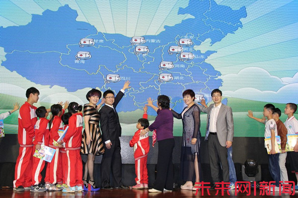5月16日,2016“青年之声 点亮未来 守护健康”爱心万里行 关注留守儿童健康成长启动仪式发布会举行。留守儿童代表与嘉宾共同触发爱心万里行地图。 未来网记者 李文亚摄。