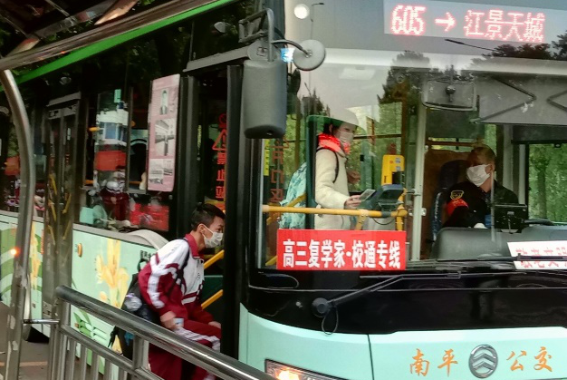 4月7日,高三复学第一天,福建省南平八中学生放学后正准备搭乘605路临时公交专线返回家中。为护航高三学子复课,南平市公交部门因地制宜,在4月7日至30日期间,开通三条“家·校通”临时公交专线,严格遵守安全和防疫要求,“点对点、一站式、零换乘”,全面保障高三学生复学乘车需求。
