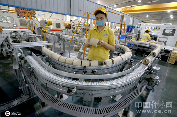 2019年9月17日,四川环龙新材料有限公司的工人们正在包装生产“斑布”竹材料本色纸。近年来,四川省眉山市通过政策引导和资金扶持,加大对竹产业制造企业的技术改造。经过技术改造和投入后,企业产能效益及市场竞争力大幅提升。(图片来源:东方IC)