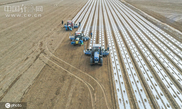 2020年4月1日,无人驾驶GPS卫星导航播种机在塔里木乡播种棉花。(图片来源:东方IC)
