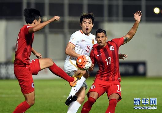 11月17日,中国队球员郑智(中)在比赛中拼抢。 当日,在2018年世界杯亚洲区预选赛C组比赛中,中国队客场战平中国香港队。新华社记者卢炳辉摄