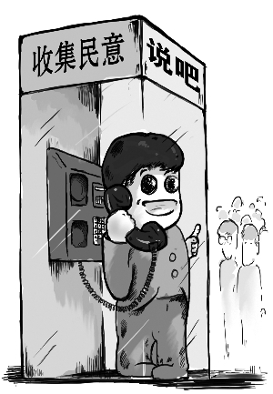 山西平遥街头设“说吧”,类似电话亭专门收集民意。“说吧”设在平遥县繁华地段之一的峰岩广场,是一个类似于公用电话亭的相对独立空间。每一位走进这里的群众对整治“四风”有什么愿望和诉求、对平遥发展有什么建议,以及在工作生活中遇到什么困扰,都可以畅所欲言。(3月12日《山西晚报》)