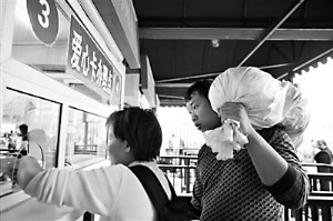 停售站台票后,乘客办理“爱心卡”送站。(图片来源:北京晨报)