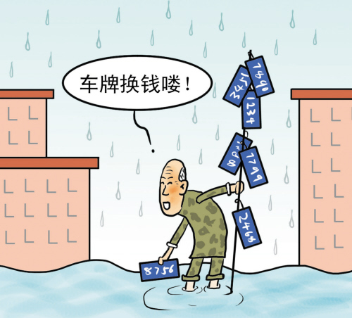 7月26日上午,记者在武汉市汉阳区黄金口工业园一路口看到,路边一工地门前挂了一串汽车车牌,有十几副。“这是谁挂的,要不要钱?”面对记者询问,几名工人嬉笑着说:“100元一副,交钱就可领走!”车牌在大雨中脱落,有老人乘机下水捞起要钱,究竟这钱赚不赚得?(7月27日《武汉晨报》)