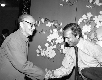 1980年7月,时任财政部部长、世界银行中国理事吴波在北京招待世界银行代表团客人。 新华社记者 张桂玉 摄