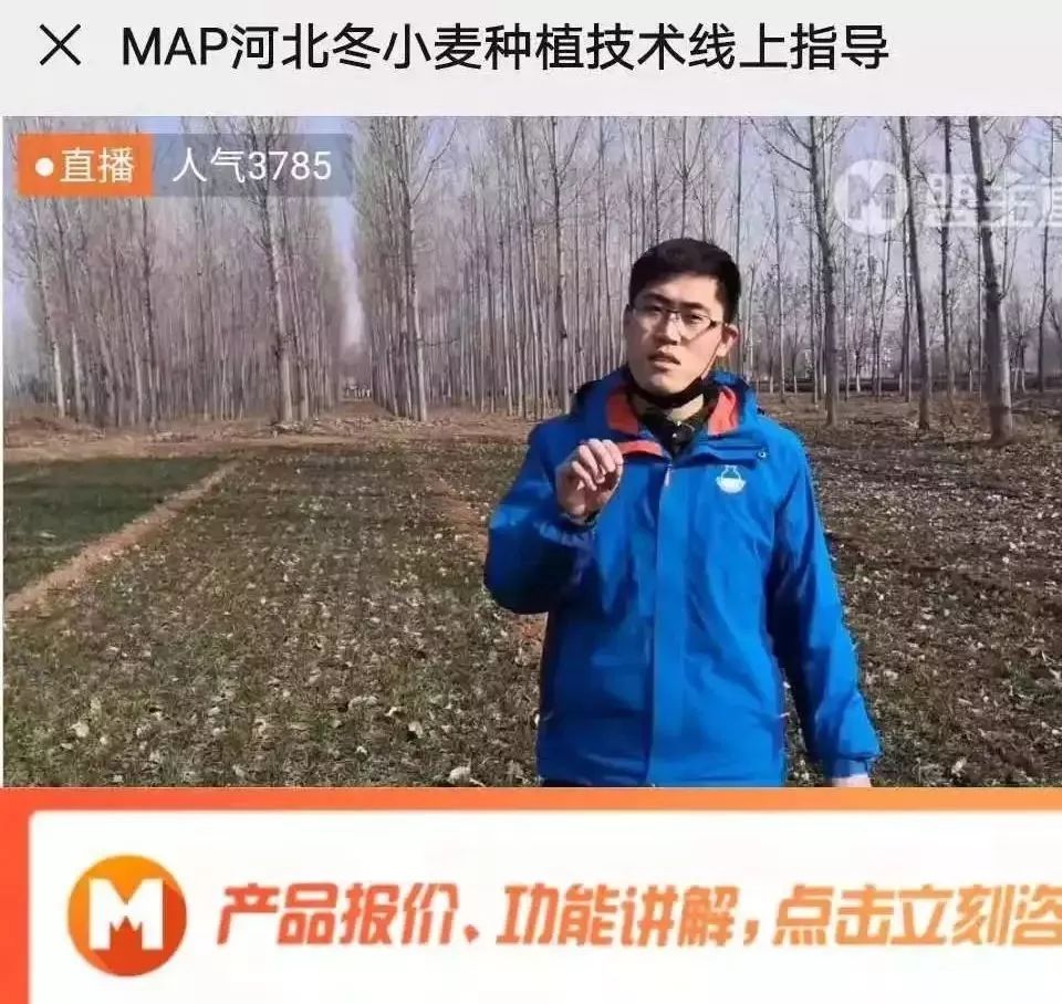 中化农业MAP粮作河北省区Mapper通过田间现场直播方式,探查苗情,为种植户解疑答惑。一个小时的直播,收视高峰达到了4千多人观看。农户通过直播间留言了解小麦苗情、用肥、用药及管理知识,由Mapper农艺师担任的主播一一解答,为农户进行线上技术指导。