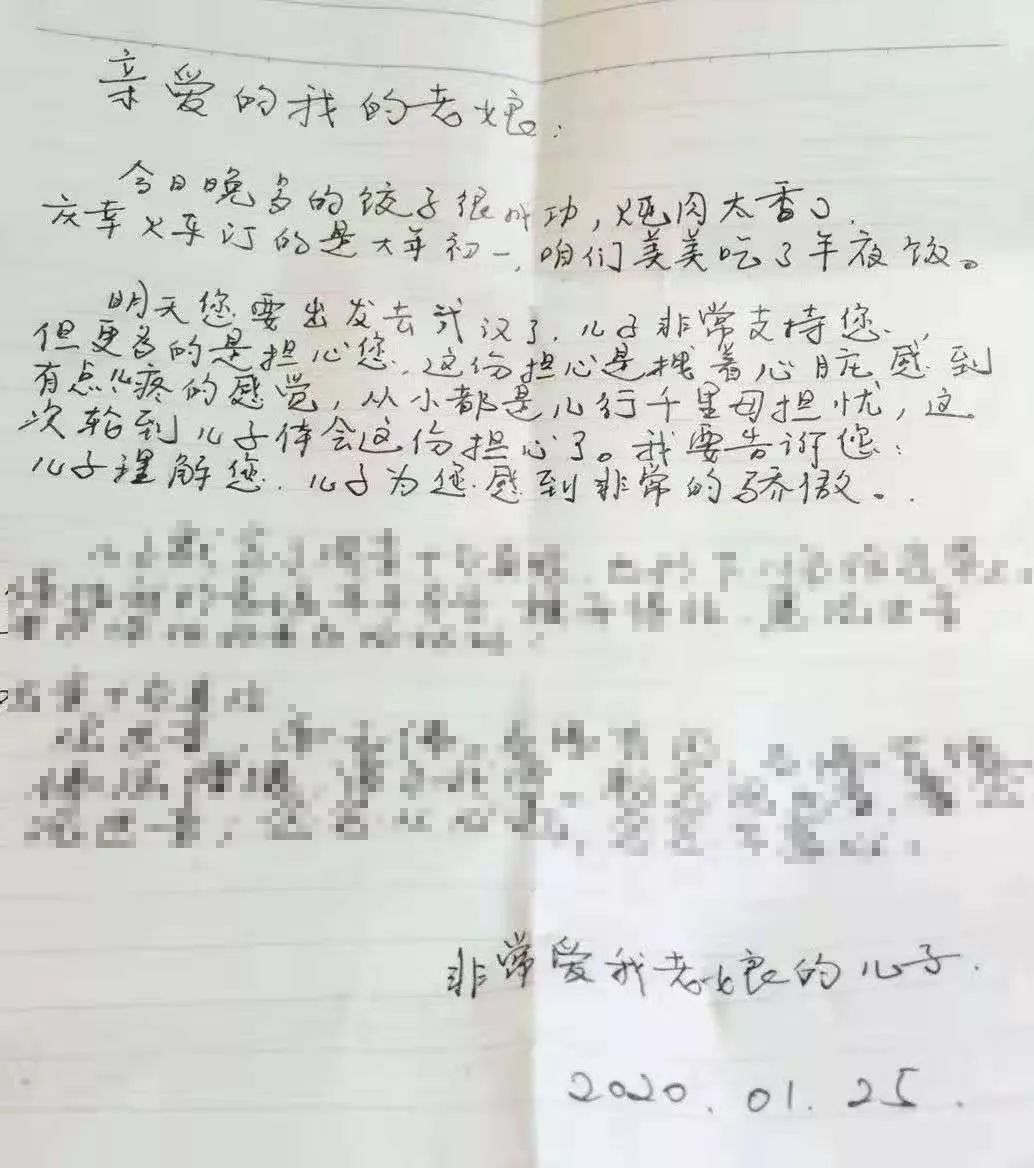 李主任说:“我坚信这场战役一定会打赢!全国各地医疗队就位,患者隔离到位,疫情是可以控制的。”临行前,李素英的儿子给她写了这样一封信: