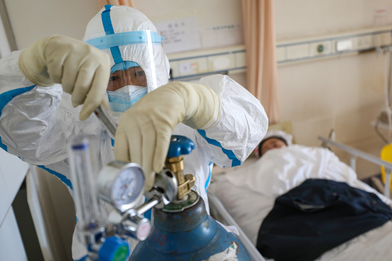 2020年2月16日,武汉红会医院,邓新财在隔离病房换氧气瓶上的流量阀。(陈卓 摄)