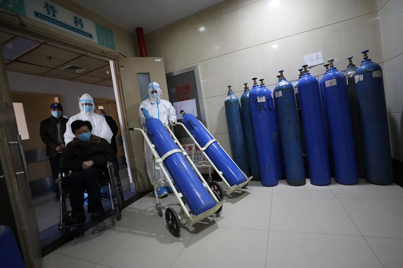 2020年2月16日,武汉红会医院,邓新财在搬运氧气瓶时遇到患者去检查,赶紧让路。(陈卓 摄)