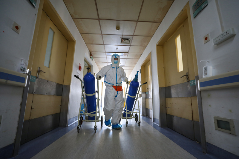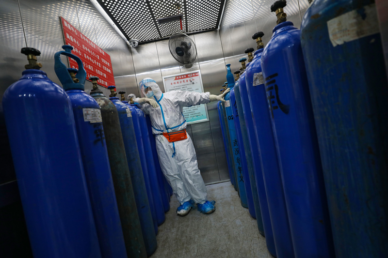 2020年2月16日,武汉红会医院,邓新财用拖车拖着氧气瓶一路小跑送到隔离病区。(陈卓 摄)