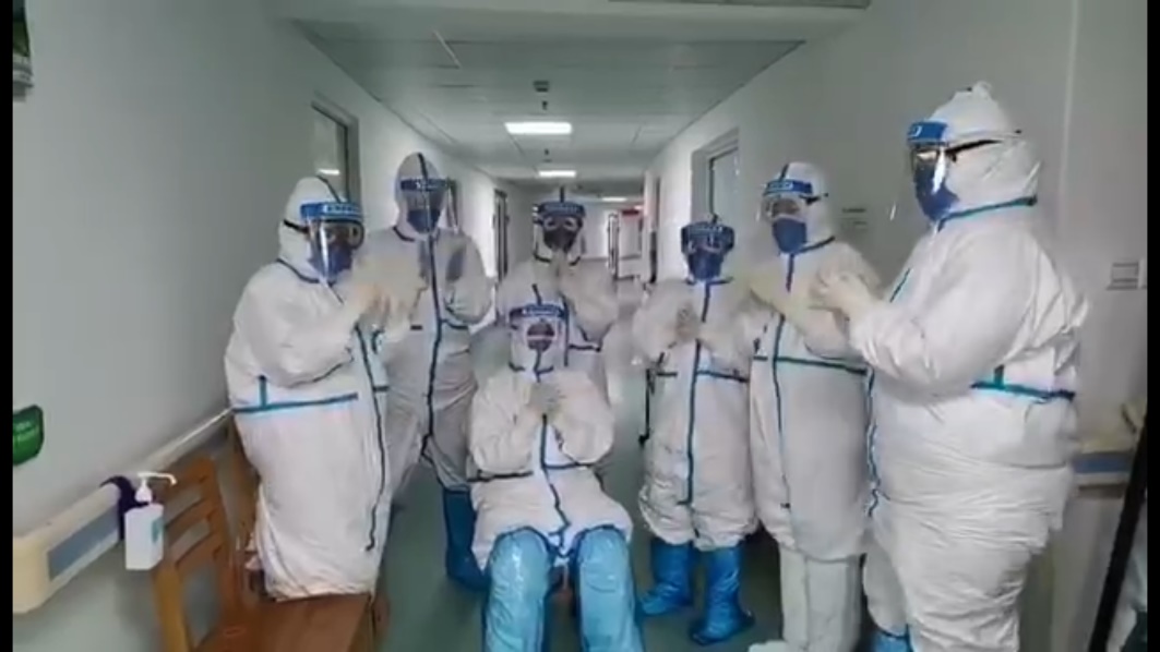 今天一早的大群里,放了一段视频,这是上今天零点到四点班的内围护士,在换好衣服进隔离病房前6个姑娘围站在一起,中间一个姑娘端坐着,唱着生日快乐歌。这是一个来自隔离病房的生日祝福,大家穿着厚厚的防护服,看不出谁是谁,但从歌声里能听到大家的满满祝福和团队的爱心。看样子今天又有谁生日了,是谁这么幸运的在我们到达武汉的“满月”过生日?