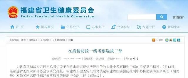 在疫情防控中,为进一步加强福建省疾控中心的领导力量,福建省卫健委党组向福建省委组织部建议,提任邓艳琴为省疾控中心副主任。福建省委组织部第一时间派出干部考察组深入疫情防控一线,对邓艳琴的一贯表现特别是在疫情防控中的实际表现等方面,进行近距离、全方位、多角度的深入考察和了解。考察之后,福建省委组织部立即研究批复了邓艳琴的任职。