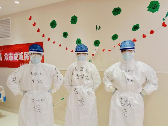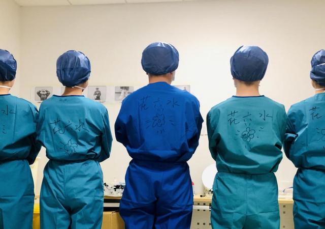 2月22日,正在这里治疗的石阿姨惊奇地发现,刚刚交班进来的这组护士的防护服胸前统一地写着“花六水”,旁边还画着一朵有六个花瓣的花朵。石阿姨好奇地打听:“你们那‘花六水’和花朵都是什么意思呀?”