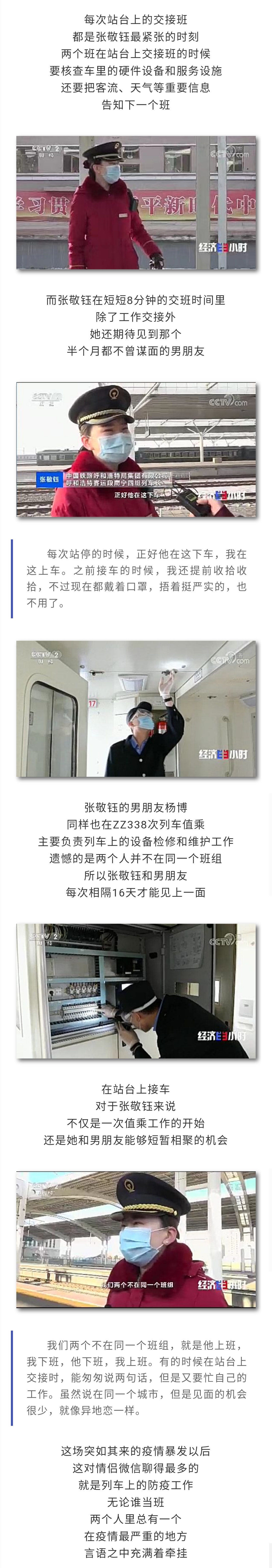 每次相隔16天才能见上一面。在站台上接车,对于张敬钰来说,不仅是一次值乘工作...这场突如其来的疫情暴发以后,这对情侣微信聊得最多的 就是列车上的防疫工作。