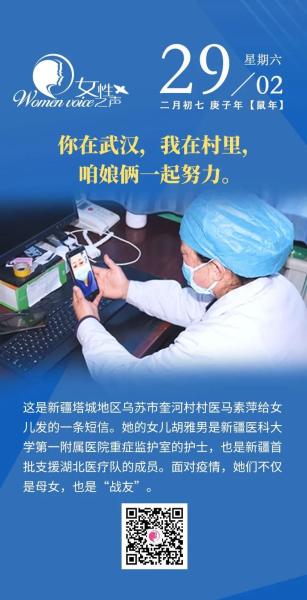今年53岁的马素萍,是新疆塔城地区乌苏市夹河子乡奎河村的一名村医。26岁的女儿胡雅男是新疆医科大学第一附属医院的护士。在猝不及防的疫情面前,母女俩都主动请战,选择到第一线去“战斗”。作为新疆第一批驰援湖北医疗队队员,胡雅男在武汉大学人民医院东院重症监护室工作。马素萍在村里负责居家隔离人员的体温检测、登记上报,做好重点场所的消毒工作,还要给一些患有慢性病的村民送药、测量血压。胡雅男说:“我知道,妈妈和家人都特别担心我,只要我一休息,我会第一时间给妈妈打电话或者视频聊天。工作很辛苦,现在治愈率提高,加上全国各地医疗技术的支援,爱心人士捐钱捐物……这样的好消息不断传来。我坚信,举国上下同舟共济,我们一定会成为这场疫情防控阻击战最后的赢家。”