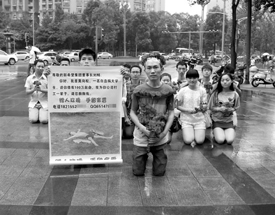6月30日,在成都市武侯区航空路新希望大厦外,一名患有白血病的大学生身绑玫瑰花携14名大学生集体下跪,他们手持玫瑰,并举出“借我100万,我打工还你一辈子”字样的广告牌向新希望集团董事长刘畅借款100万治病。
