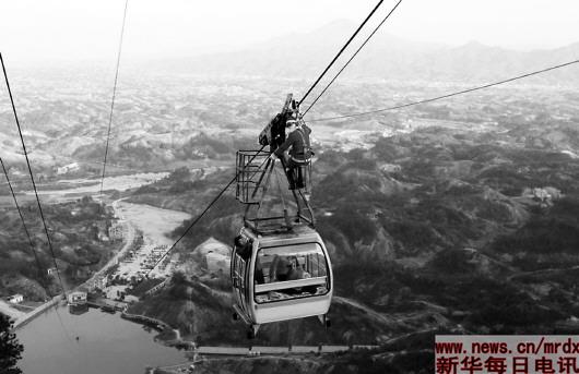 12月21日,湖南平江某景区的一位工作人员,装扮成“圣诞老人”,爬上高空索道为游客派送圣诞礼物,以此迎接即将到来的圣诞节。